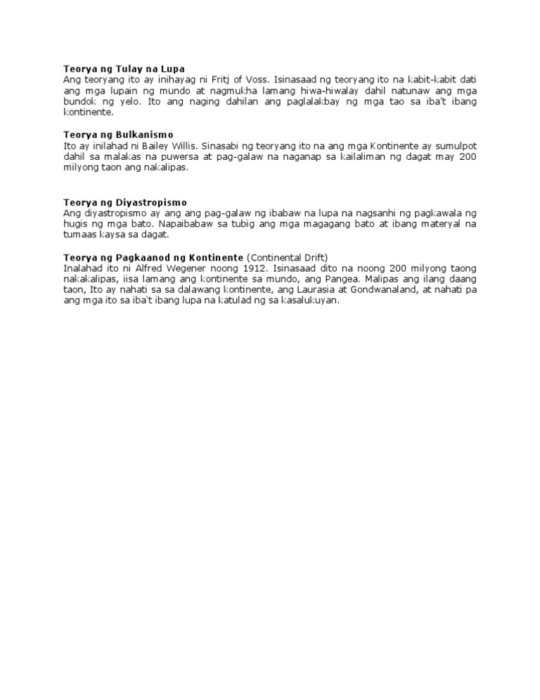 Lahat ba ng lugar sa Pilipinas ay maaaring makaranas ng lindol. Isinasaad ng teoryang ito na kabit-kabit dati ang mga lupain ng mundo at nagmukha lamang hiwa-hiwalay dahil natunaw ang mga bundok ng yelo. Promise po sainyo mga first year tama ito Tulay na Lupa.