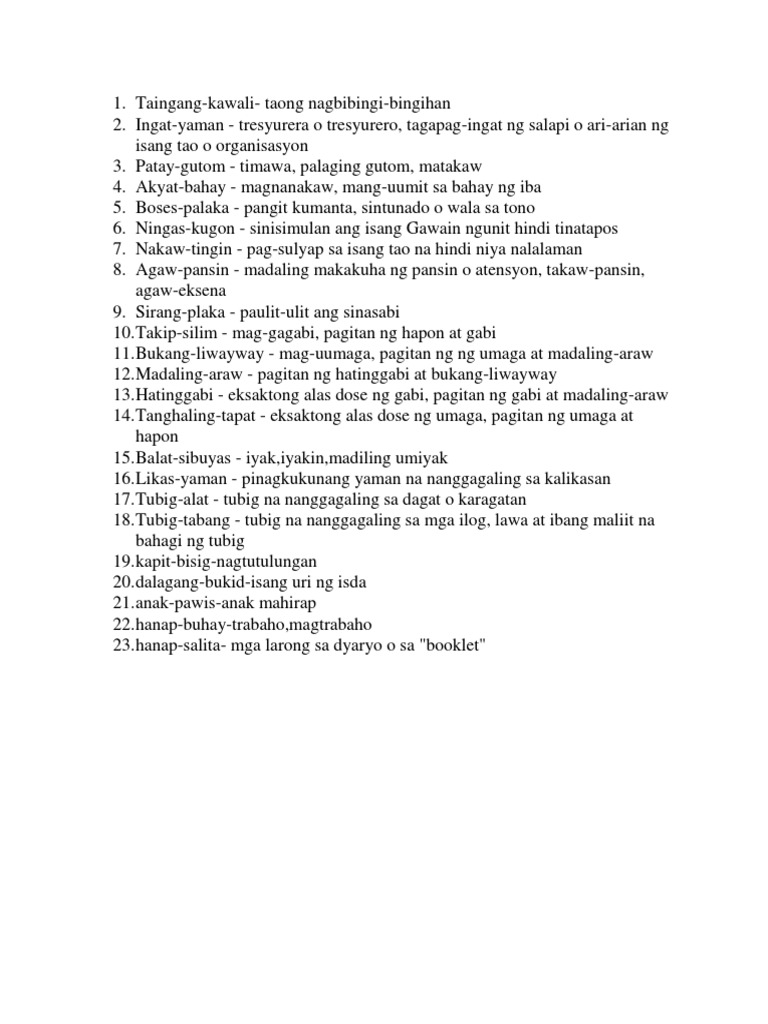 Anak-pawis Bahag-hari Balat-sibuyas Buntong-hininga Kapit-tuko Dahong-palay Takip-silim Bukang-liwayway. Karaniwang gingamit ang pagbuo ng tambalang salita para mas mapadali ang paggawa ng langkapang pangungusap. Magbigay ng mga tig-tatlong halimbawa ng mga salitang magkasingkahulugan magkasalungat gamit ang pahiwatig pangungusap at diksyunaryong kahulugan sa likod ng kupon.