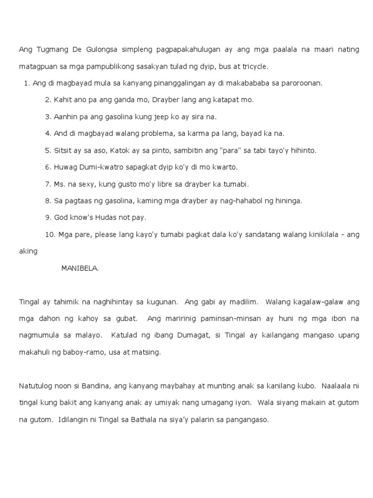 Tugmang de gulong limang halimbawa. Halimbawa ng isang bulong ay Tabi tabi po. - Ito ay mga simpleng paalala sa mga pasahero na maaari nating matagpuan sa mga pampublikong sasakyan tulad ng jeepney bus at traysikel-maaari itong nasa anyo ng salawikain maikling tula o kasabihan HALIMBAWA Ang di. Ang Tugmang De Gulong sa simpleng pagpapakahulugan ay ang mga paalala na maari nating matagpuan sa mga pampublikong sasakyan tulad ng dyip bus at tricycle.