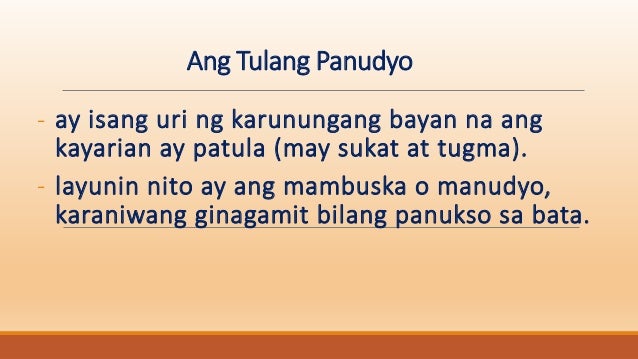 Magsimula muna tayo sa kahulugan ng tulang panudyo. Ang batang mahilig mag-abot ng bayad sa jeep paglaki kundoktor. - Ito ay mga simpleng paalala sa mga pasahero na maaari nating matagpuan sa mga pampublikong sasakyan tulad ng jeepney bus at traysikel.