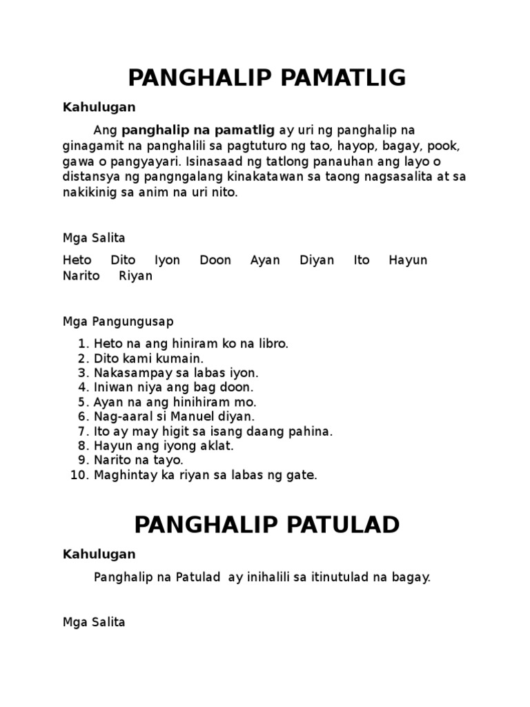 Uri ng panghalip narito ang isang pagtalakay sa limang 5 uri ng panghalip pati na rin ang mga halimbawa ng bawat isa. Mga halimbawa ng panghalip pamatlig sa pangungusap patulad ganyan ang aklat na nais kong basahin. Isa sa mga bahagi ng pananalita ay ang panghalip o sa ingles ay pronoun.
