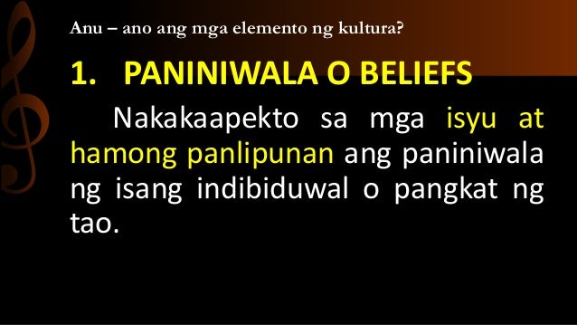 Anu ano ang mga elemento ng kultura. Ang mga ito ay mga ideya o pahayag na pinaniniwalaan ng karamihan na totoo. Bawat bansa ay may kani-kanilang pinaniniwalaan o nakagawiang gawain na ipinamana ng kani-kanilang mga ninuno.