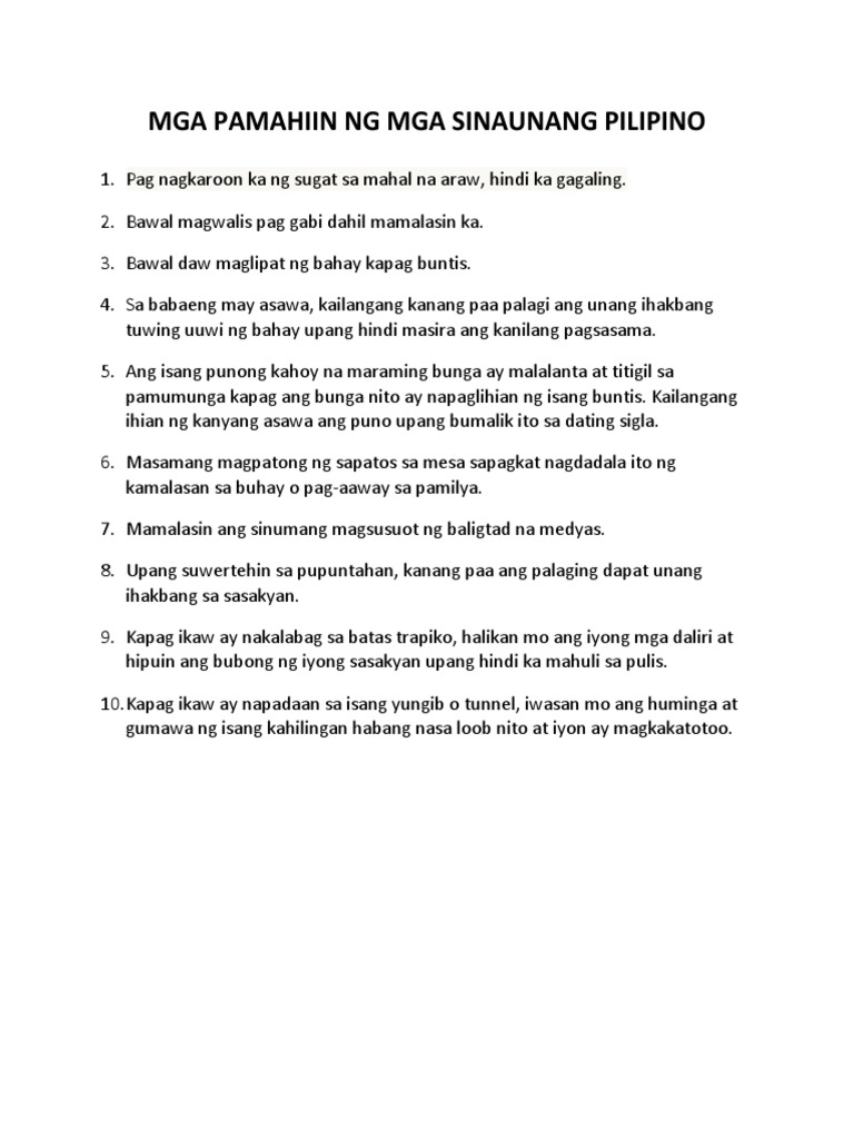 Pamahalaan ng Sinaunang Pilipino Barangay Datu Sultanato Sultan Ang sultanato ay isang sistema ng pamamahala na batay sa katuruan ng Islam Sharif ul-Hashim ang nagtatag ng unang sultanato sa pilipinas at tumayo ring sultan nito. Do not remove plates while an unmarried woman is still eating. Ang mga Pamahiin o Superstitions sa wikang Ingles ay mga paniniwala ng mga matatanda na madalas ay walang batayan at hindi maipaliwanag kung bakit kinakailangang sundin.