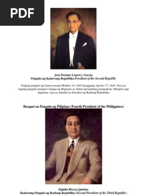 Siya ang nagwagi bilang Pangulo. Laurel - Si Laurel ay ang unang naging pangulo ng ikalawang republika ng Pilipinas noong 1943 hanggang 1945. Ang pangalawang pangulo ng Pilipinas sa administrasyon ni Roxas na si Elpidio Quirino ang siyang pumalit matapos ang kaniyang pagpanaw.