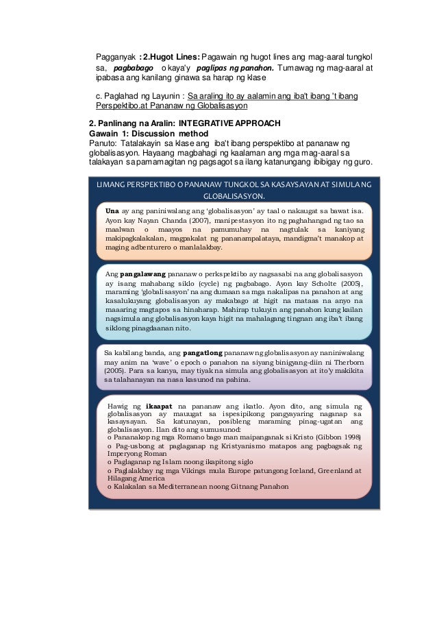 Ikalawa ang karampatang pag-aayaw-ayaw ng mga titik pantig at salita at ikatlo ang pag-uukul-ukol ng mga sadydng pananda sa lagáy tungkulin bigkás himig at katuturan ng. May limang perspektibo o pananaw tungkol sa kasaysayan at simula ng globalisasyon. Magiging daan din ang seminar upang matukoy ang ambag ng piniling susing salita sa pananaliksik at kritikal na panunuri tungo sa produksyon ng mga kaalaman.