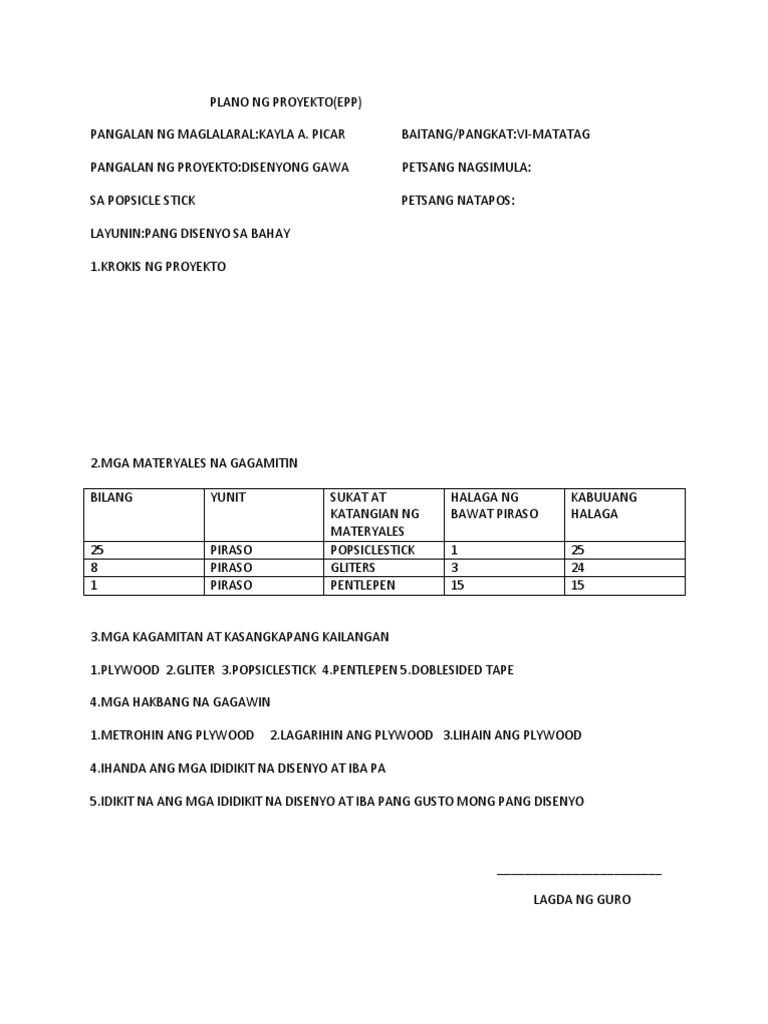 Proponent ng Proyekto John Brian Tangson Grade 12 student Elizar Valenzuela Grade 12 student Christian Santiago Grade 12 student Pamagat ng Proyekto Pagsasaayos ng Material Recovery Facility ng Aurora National Science High School MRF Pondong Kailangan 430000 Four thousand and 300 pesos Rasyonal Ang pagsasaayos ng MRF ay isang mahalagan. F6PB-Ib-54 Nagagamit ang pangkalahatang sanggunian. MGA DAPAT GAWIN SA PAGSULAT NG PANUKALANG PROYEKTO Ayon kay Jeremy Miner at Lynn Miner 2008 sa kanilang aklat na A Guide to Proposal Planning and Writing sa pagsasagawa ng panukalang proyekto ito ay kailangang magtaglay ng tatlong mahahalagang bahagi at ito ay ang sumusunod.