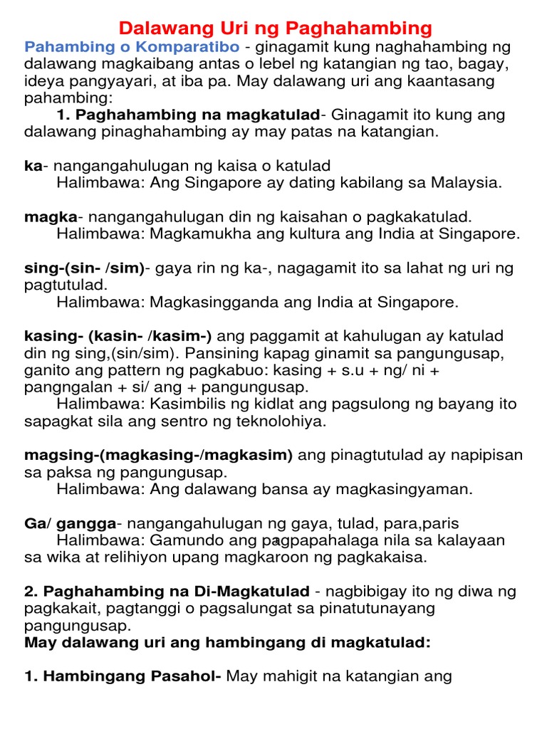 Nakakatulong ito sa pagbibigay-linaw sa isang paksa sa pamamagitan ng paglalahad ng pagkakatulad at pagkakaiba ng dalawang bagay na pinaghahambing. Paghahambing ng Magkatulad -Patas na katangian - Ginagamitan ng Panlaping.