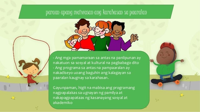 Ito ang mga solusyon at mga pagkilos na pang-iwas kung saan maaaring magtulungan ang parehong guro at magulang. Ang Aking Paaralan at ang aking mga Kaibigan Ang mga Ginagawa Ko Kasama ang aking mga KaibiganPaksa. Ang pag-iwas sa bullying sa paaralan ay mahalaga upang maiwasan ang mga seryosong kahihinatnan na karaniwang mayroon ito at upang matiyak na ang mga bata ay may mahusay na kalidad ng buhay.